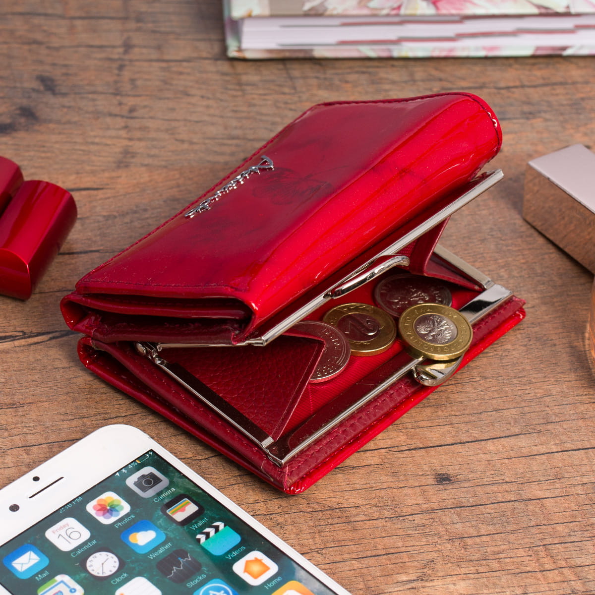 - srebrne logo na froncie portfela