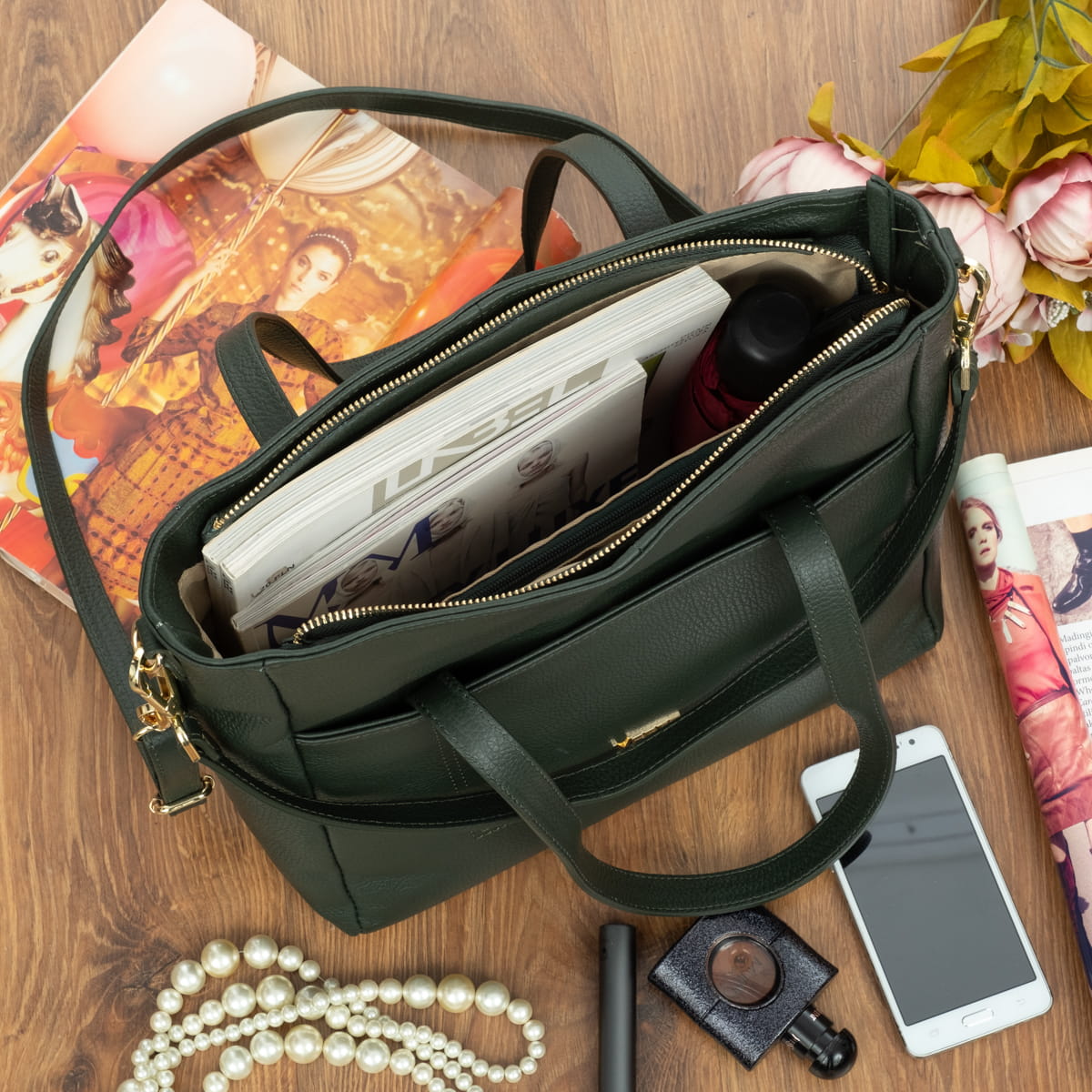 Pojemna torba damska wykonana z wysokogatunkowej naturalnej włoskiej skóry licowej. Z wygodnymi skórzanymi uchwytami i odpinanym paskiem.