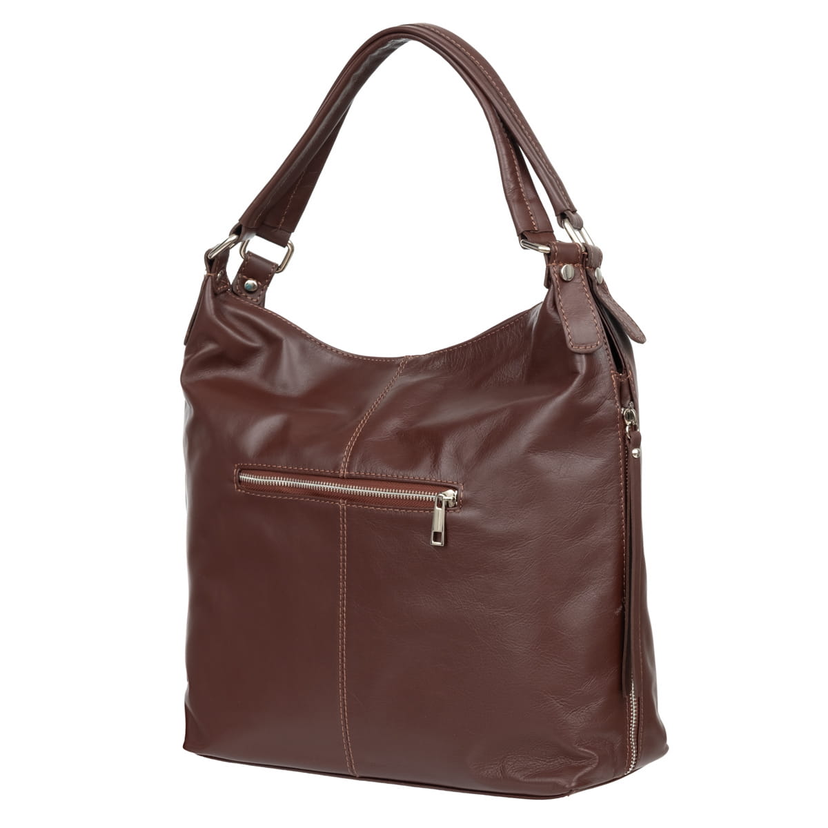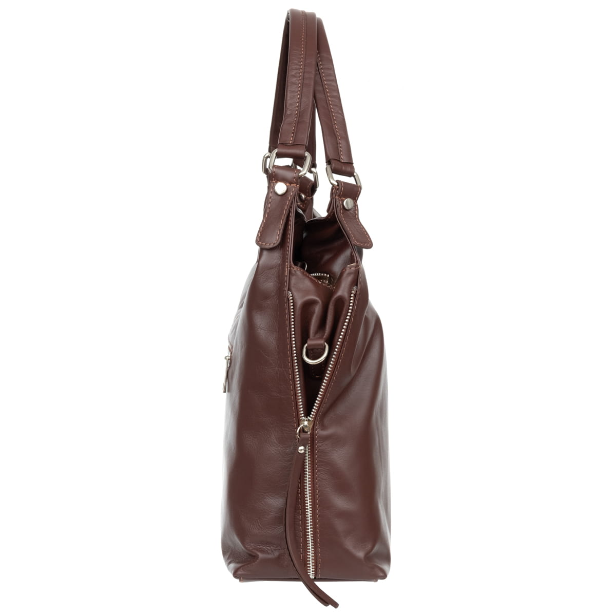 Pojemna torba damska wykonana z wysokogatunkowej naturalnej włoskiej skóry licowej. Z wygodnymi skórzanymi uchwytami i odpinanym paskiem. Torbę można powiększyć przez rozpięcie bocznych suwaków.