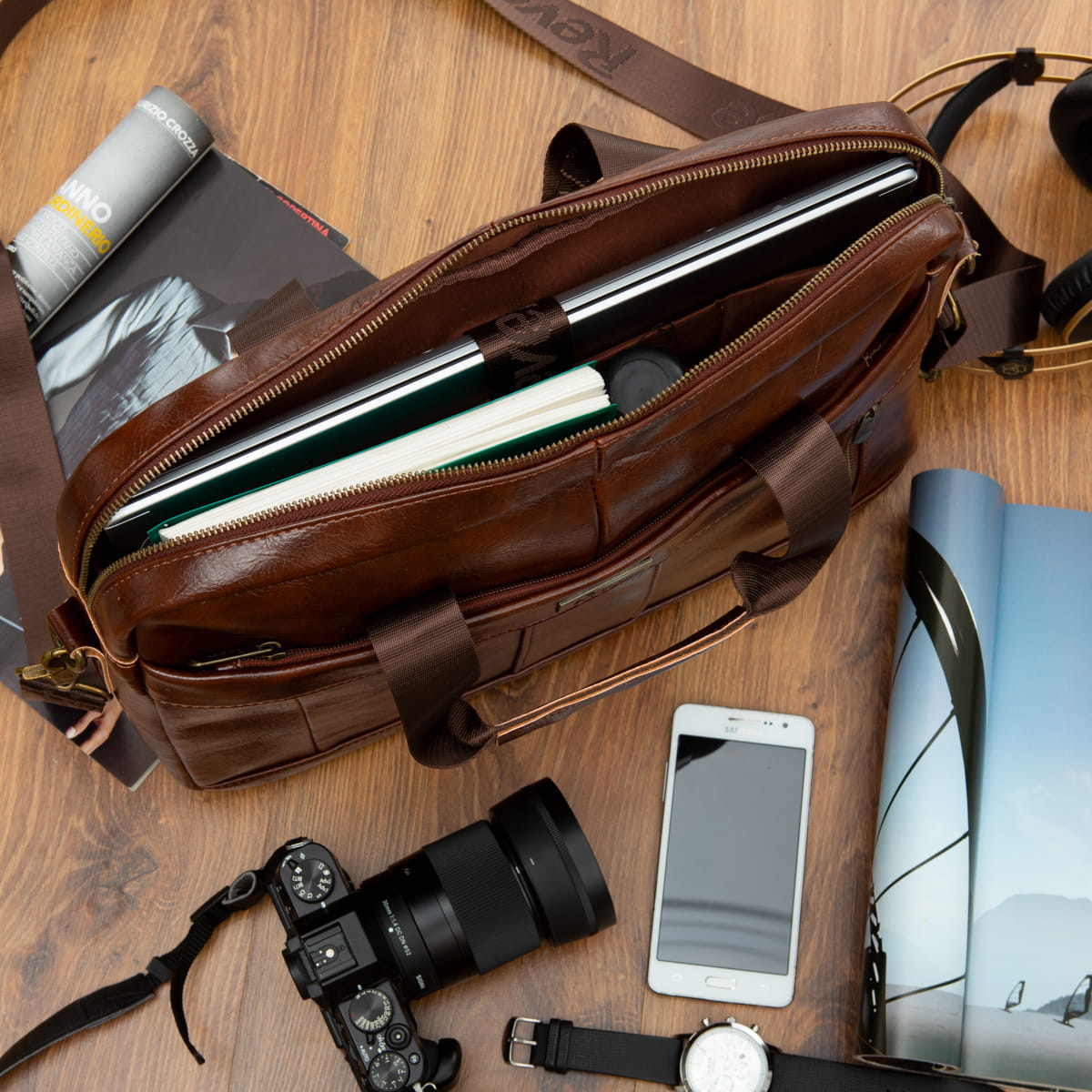 Elegancka Torba na laptop, wykonana ze skóry licowej wysokiej klasy. W torbie zmieści się laptop o przekątnej ekranu do 15.6 cala wraz z dokumentami, teczką, telefonem czy tabletem. Torbę można nosić w ręku lub na ramieniu za pomocą odpinanego paska.