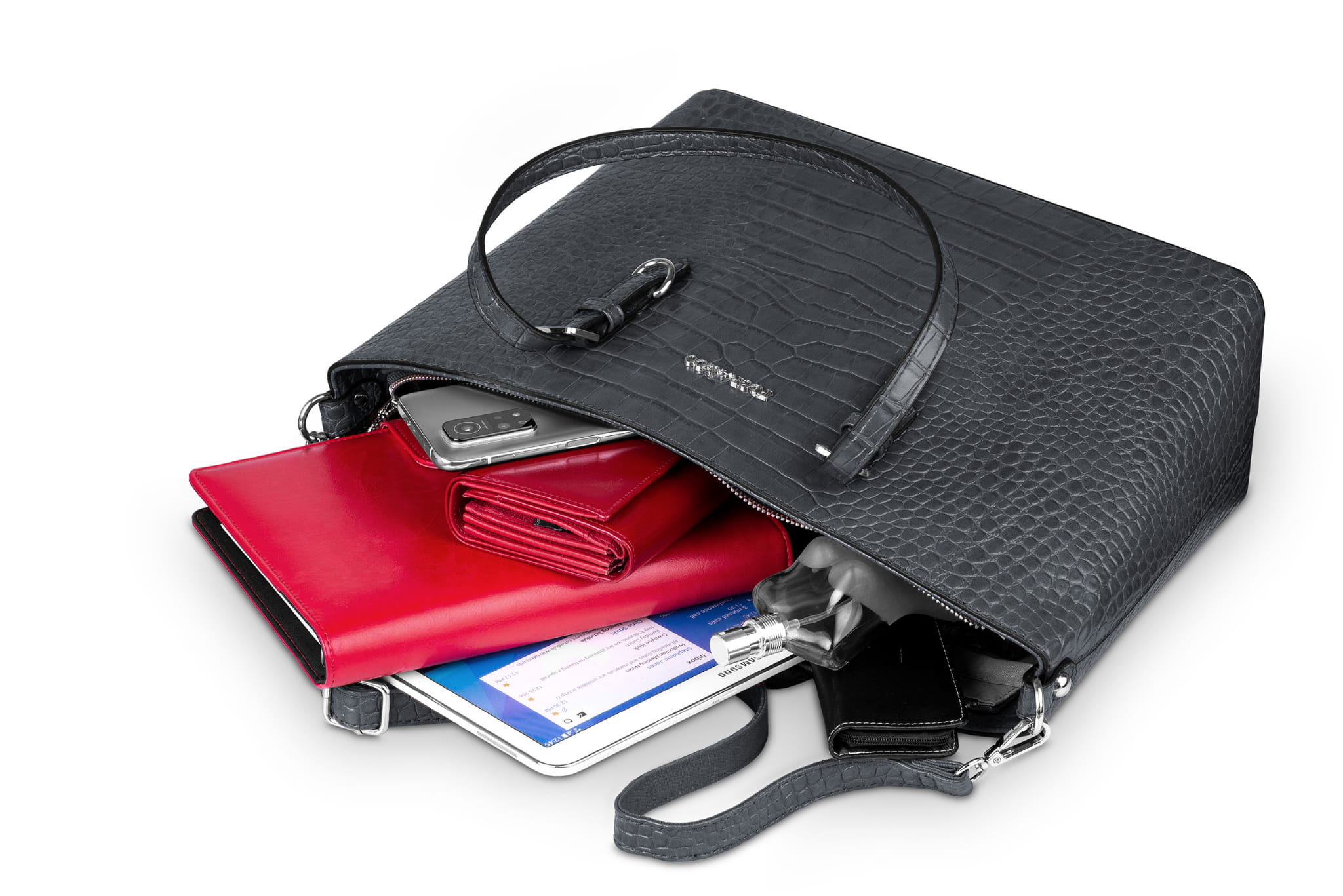 Dwie rączki i odpinany pasek na ramię umożliwiają noszenie torebki według własnych upodobań. Dzięki grubym ściankom i usztywnianemu dnu, nie zmienia ona swojego eleganckiego kształtu w trakcie użytkowania.