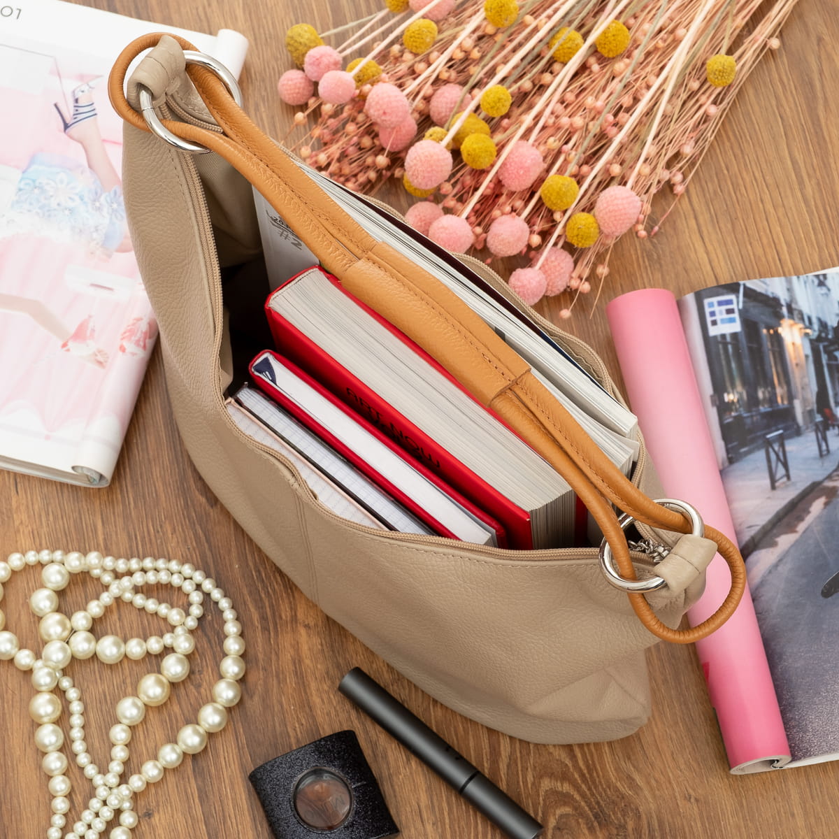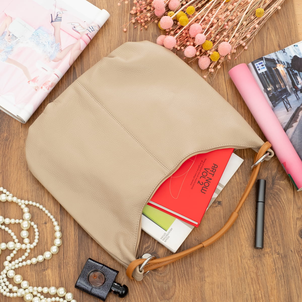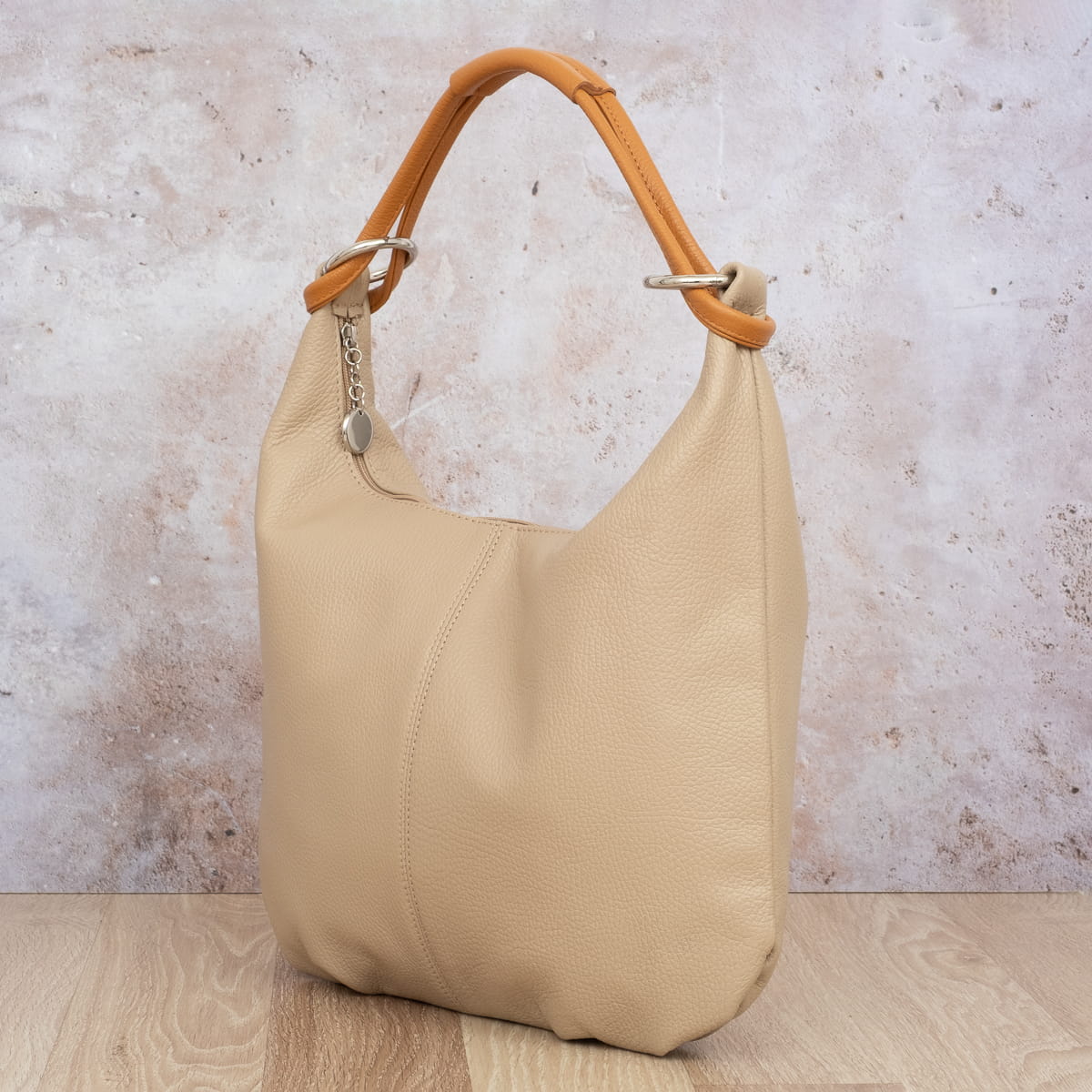 Torebka wykonana z wysokogatunkowej, włoskiej skóry licowej. Skóra została wykończona z zachowaniem naturalnej faktury. Przedmioty w torebce można wygodnie posegregować dzięki trzem kieszeniom w różnych rozmiarach. Jest przystosowana do noszenia na ramieniu lub w ręku.