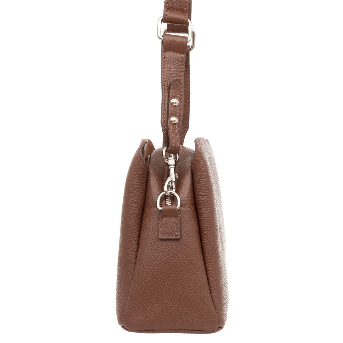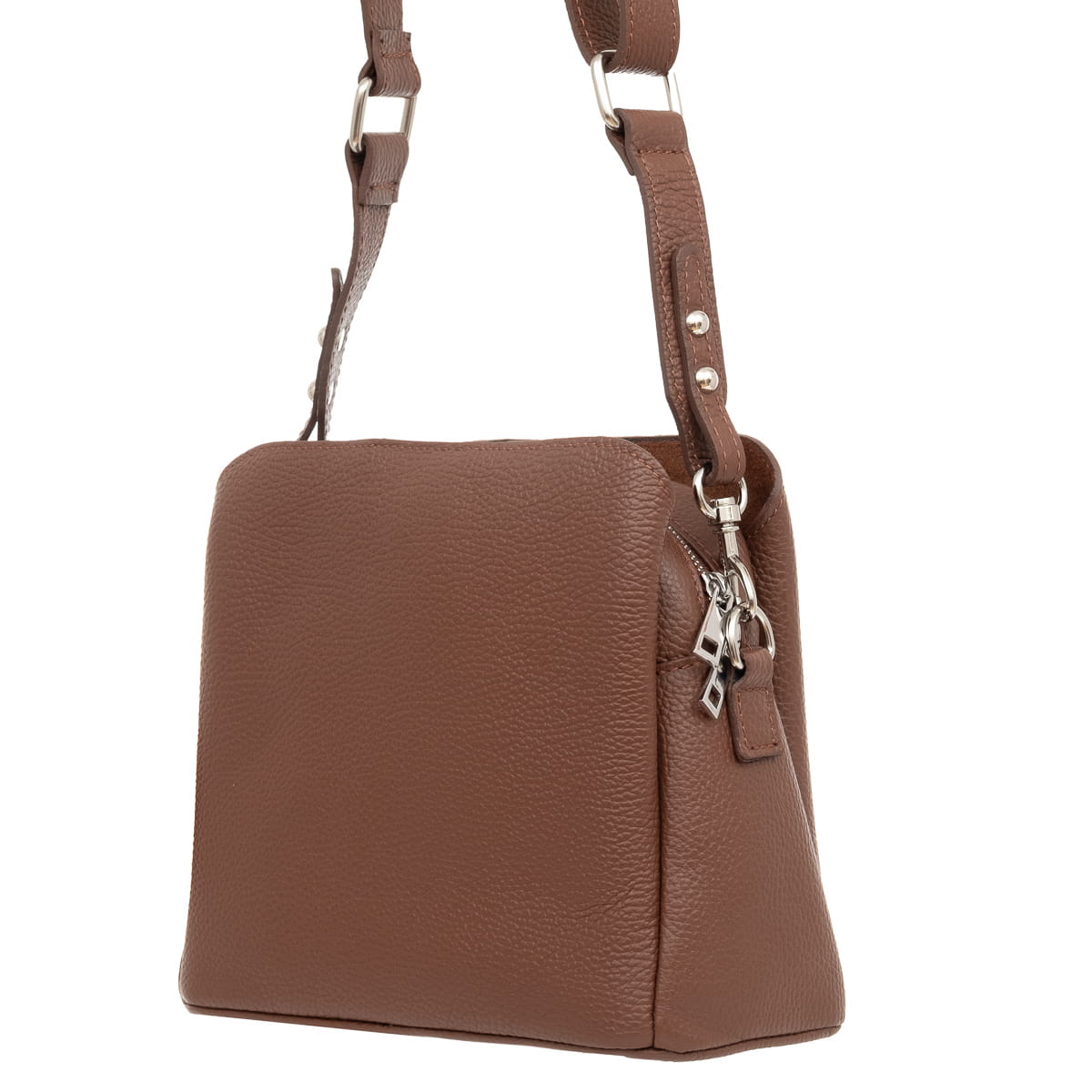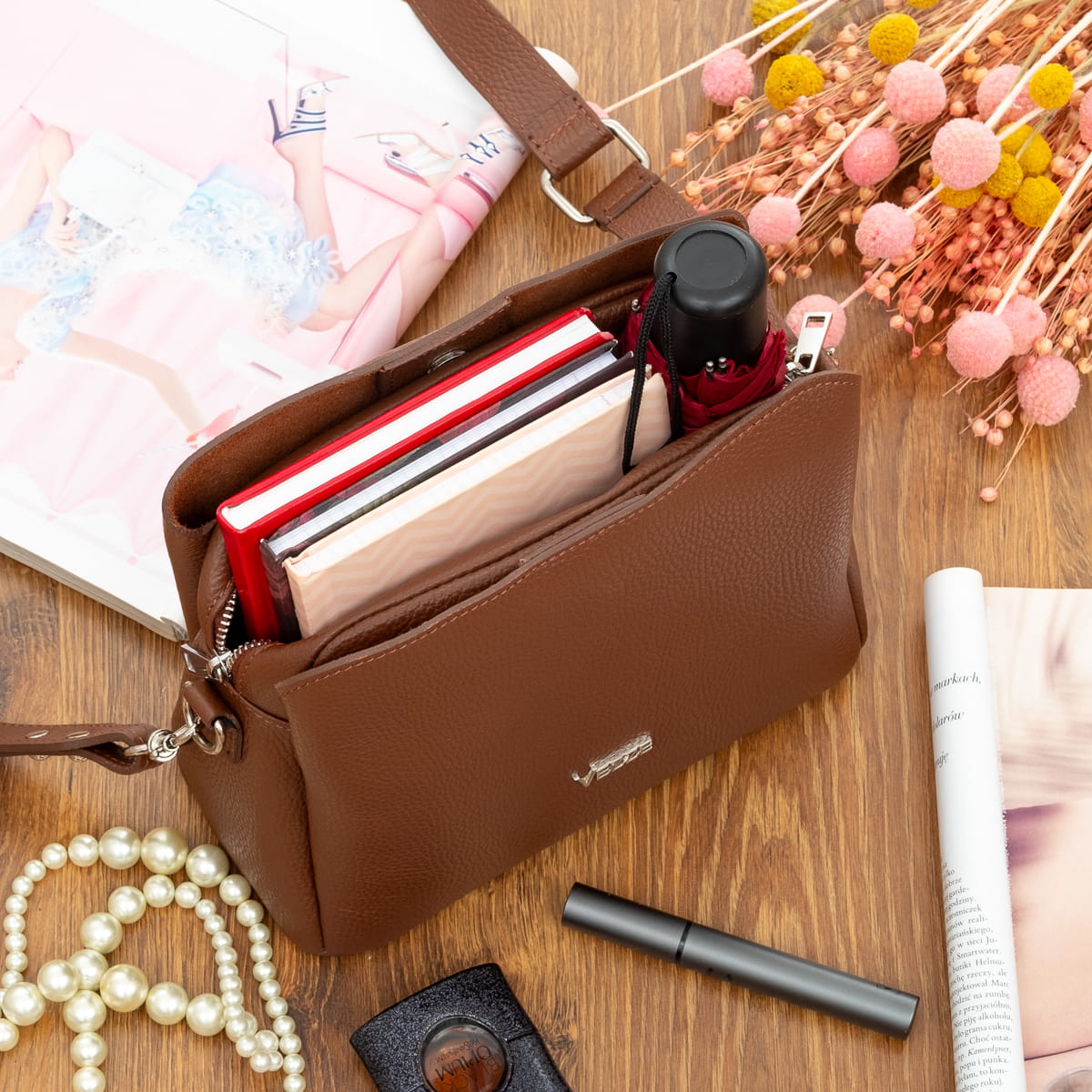 Torebka z wysokogatunkowej, włoskiej skóry licowej. Naturalna faktura skóry. Trzy komory pomagają wygodnie posegregować przedmioty w torebce. Przystosowana do noszenia na ramieniu.