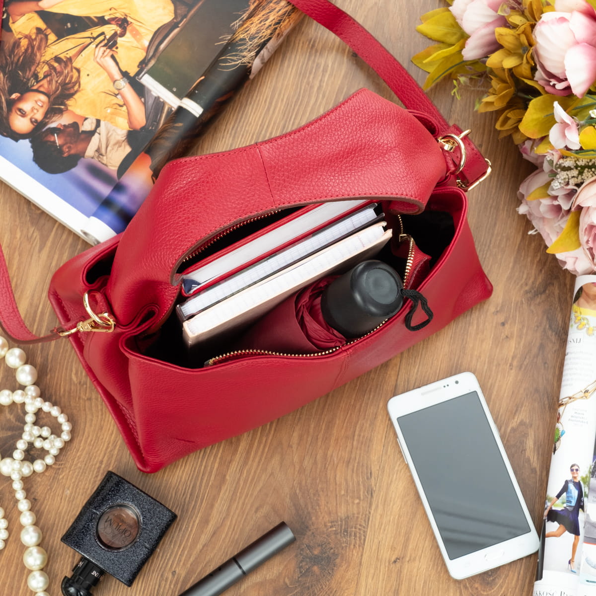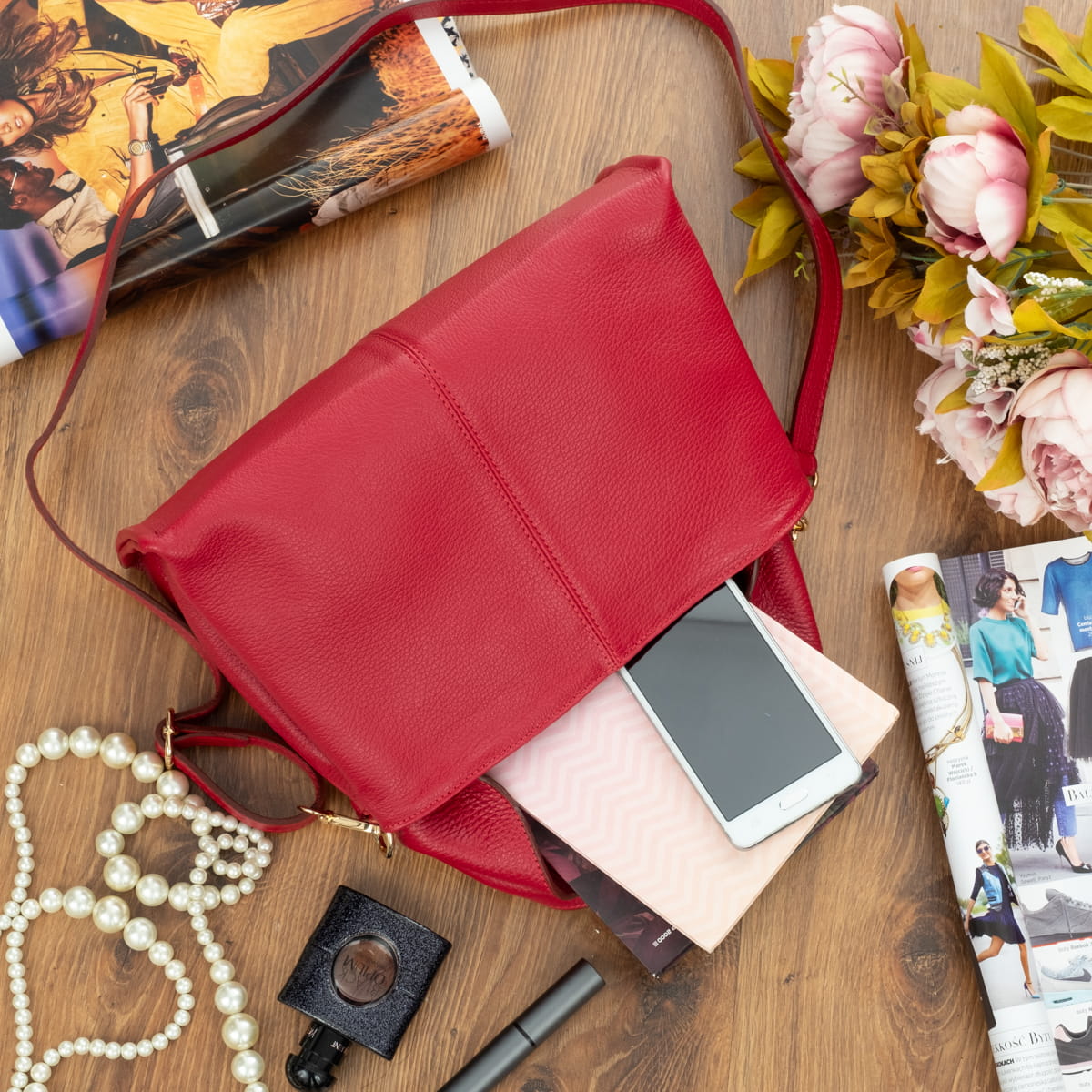 Torba damska wykonana z wysokogatunkowej naturalnej włoskiej skóry licowej. Z wygodnym skórzanym uchwytem. Przystosowana do noszenia w ręku i na ramieniu.