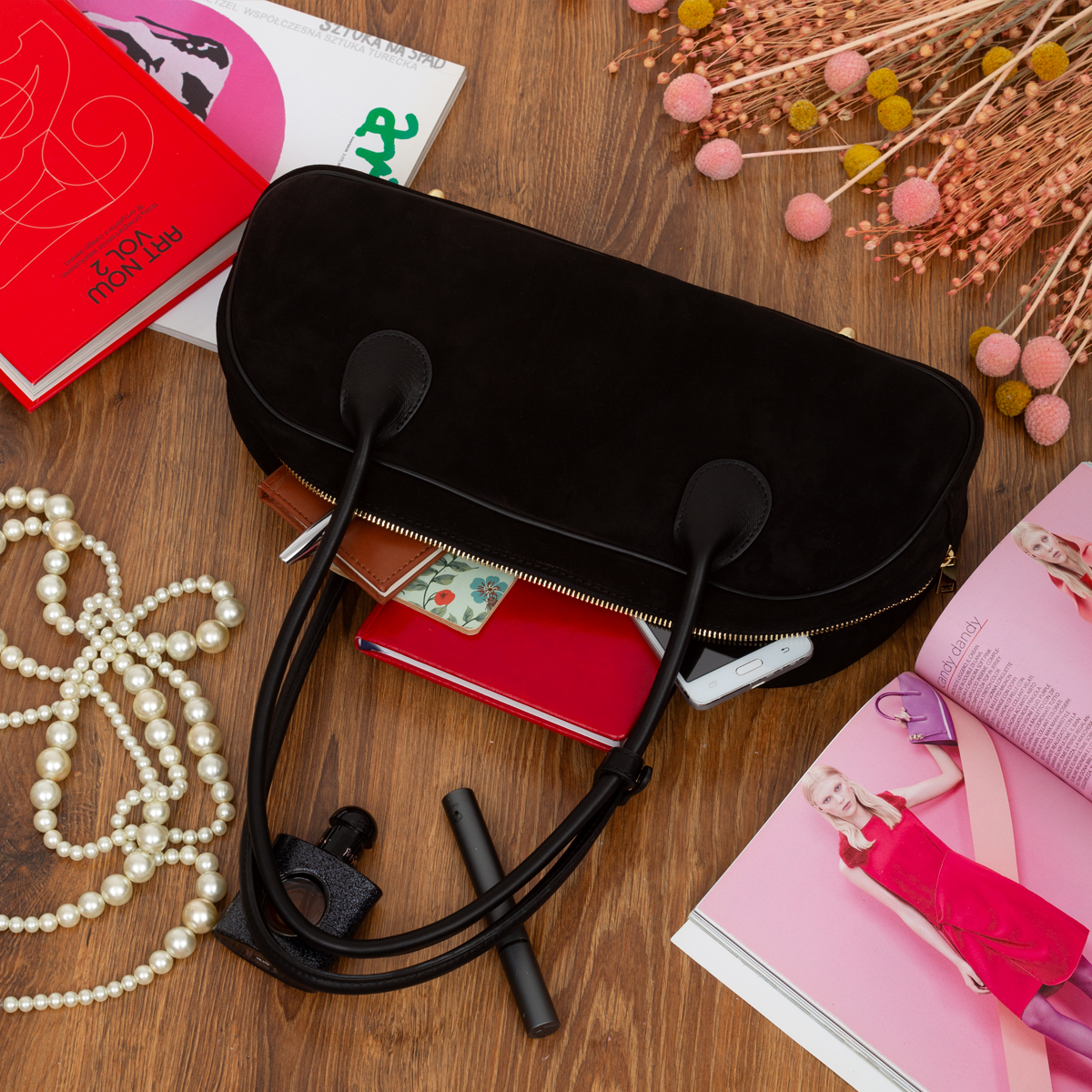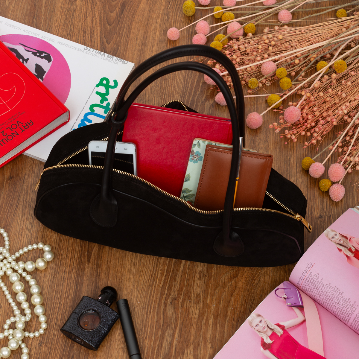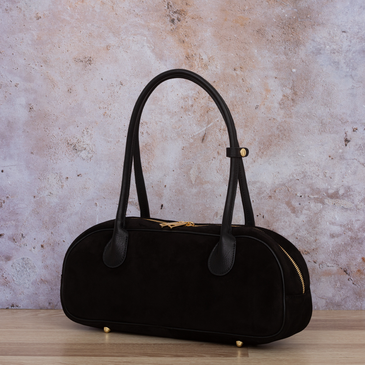 Torebka wykonana z wysokogatunkowej, włoskiej skóry zamszowej. Przystosowana do noszenia na ramieniu lub w ręku.