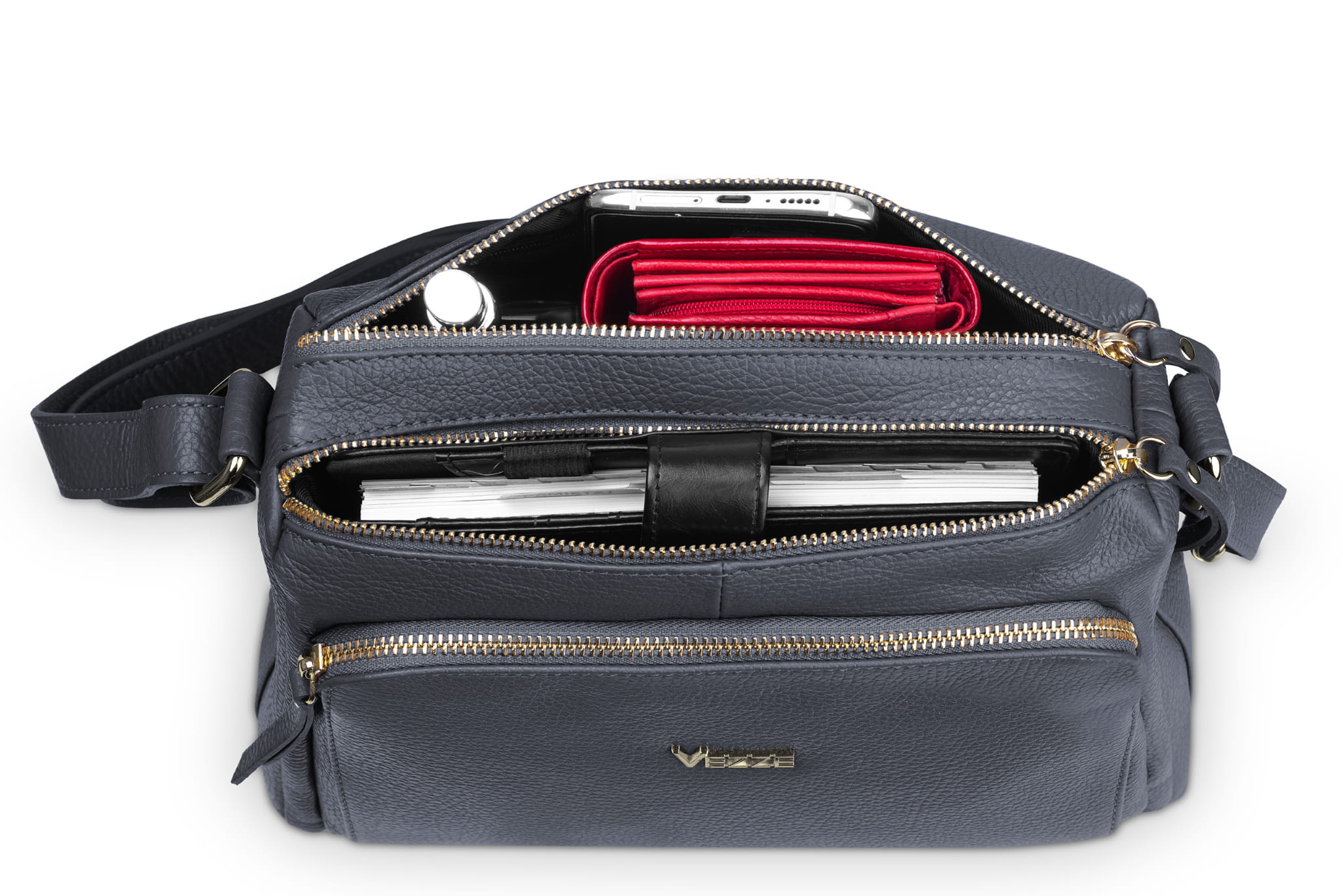 Torebka z wysokogatunkowej, włoskiej skóry licowej. Naturalna faktura skóry. Dzięki licznym komorom i kieszeniom przedmioty w torebce można wygodnie posegregować. Przystosowana do noszenia na ramieniu.