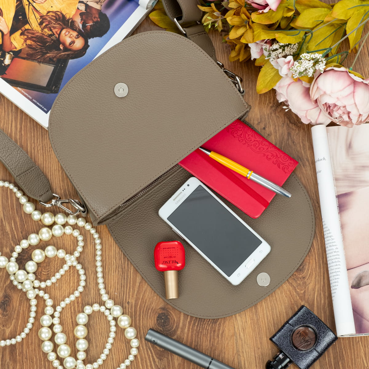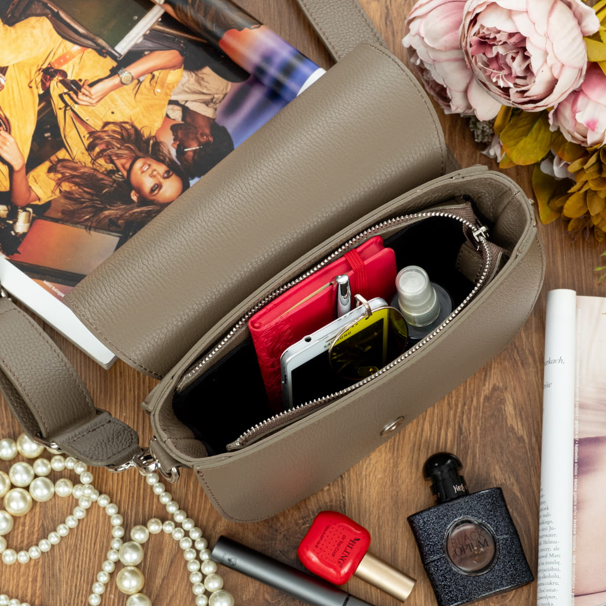Torebka na ramię z wysokogatunkowej, włoskiej skóry licowej.