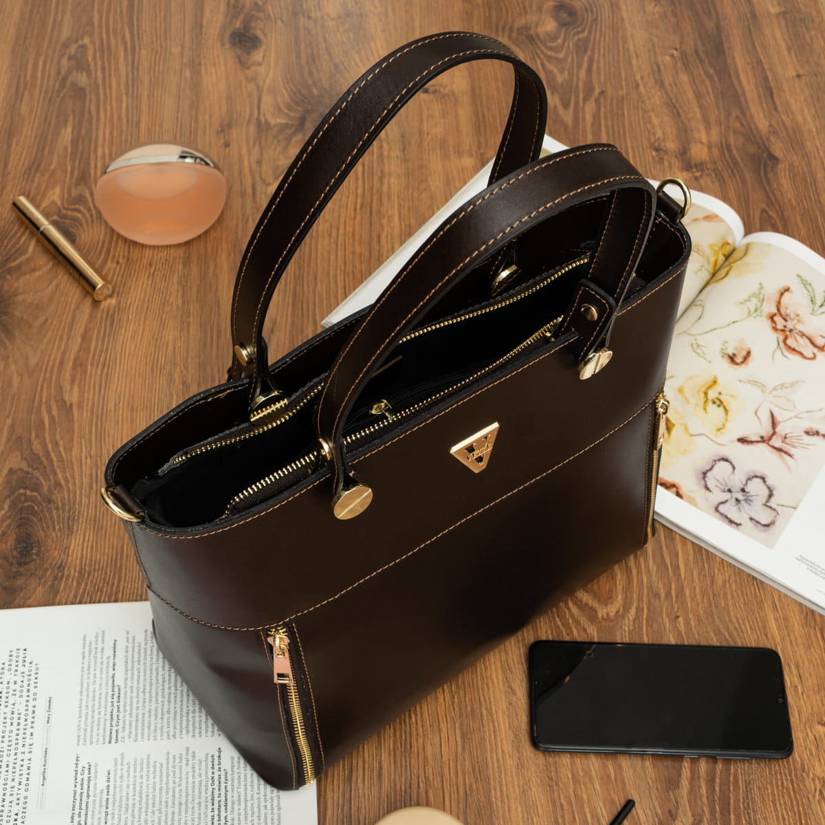 Torebka z wysokogatunkowej, włoskiej skóry licowej. Sztywne ścianki. Przystosowana do noszenia na ramieniu lub w ręku.