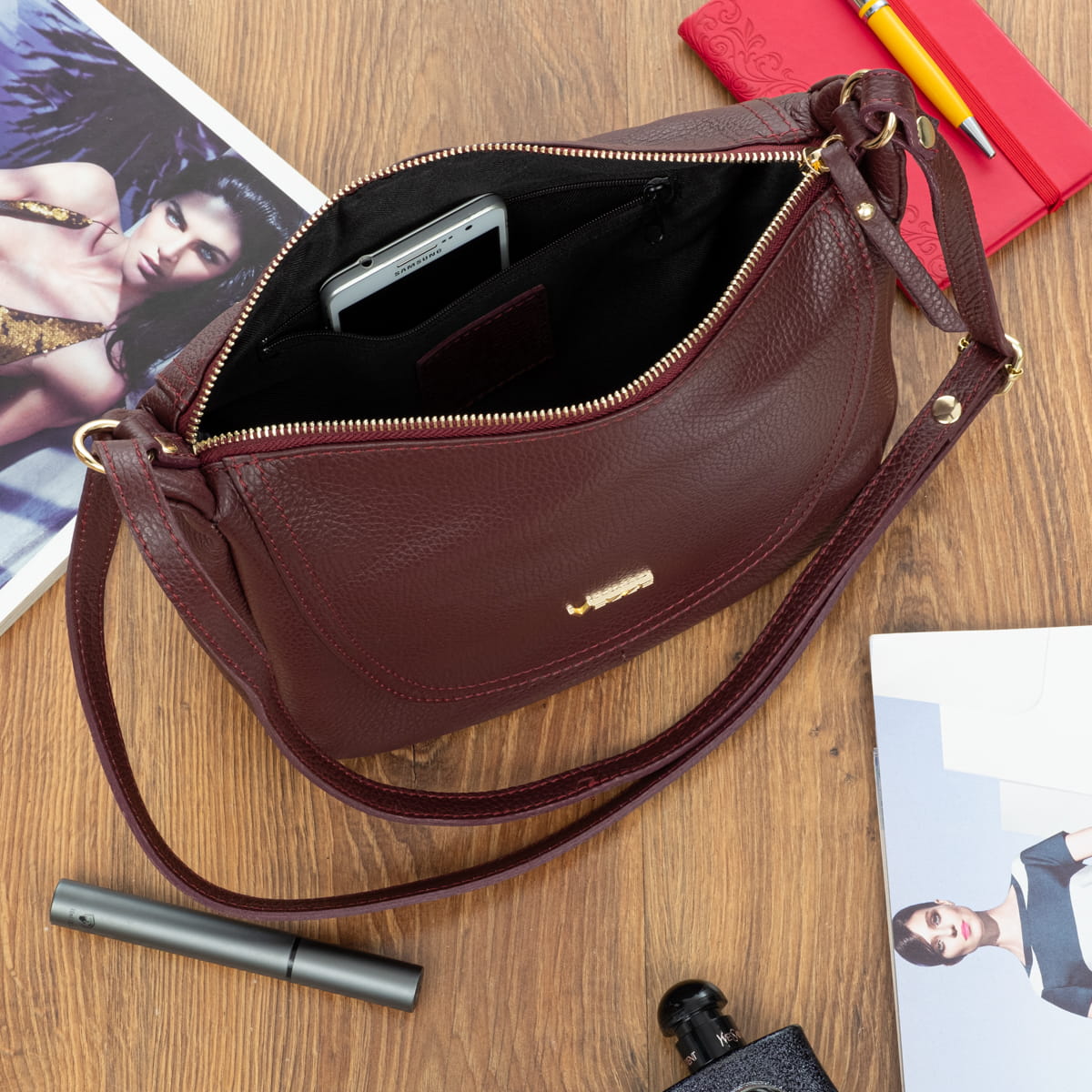 Torebka z wysokogatunkowej, włoskiej skóry licowej. Naturalna faktura skóry. Przedmioty w torebce można wygodnie posegregować dzięki trzem kieszeniom w różnych rozmiarach. Przystosowana do noszenia na ramieniu.
