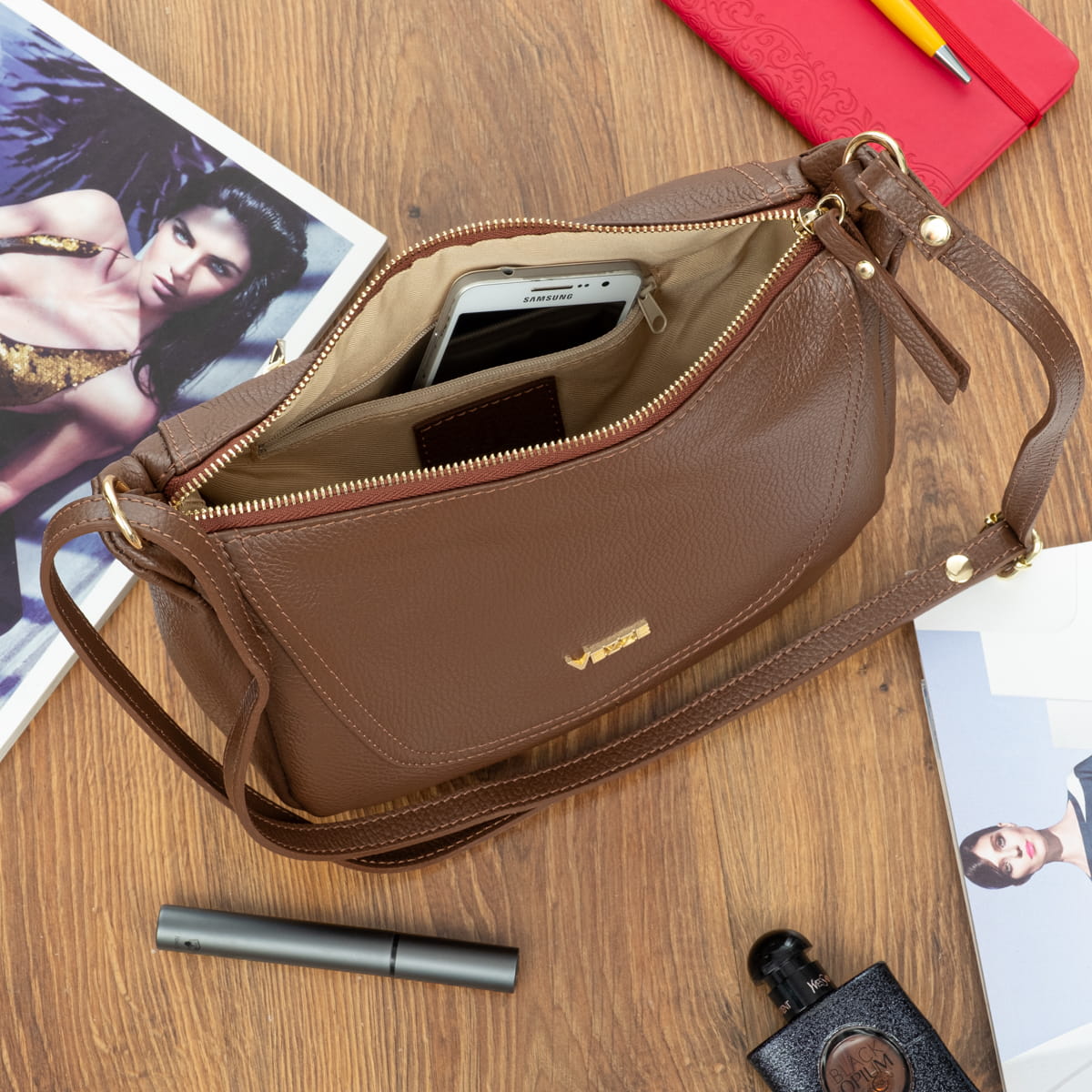 Torebka z wysokogatunkowej, włoskiej skóry licowej. Naturalna faktura skóry. Przedmioty w torebce można wygodnie posegregować dzięki trzem kieszeniom w różnych rozmiarach. Przystosowana do noszenia na ramieniu.