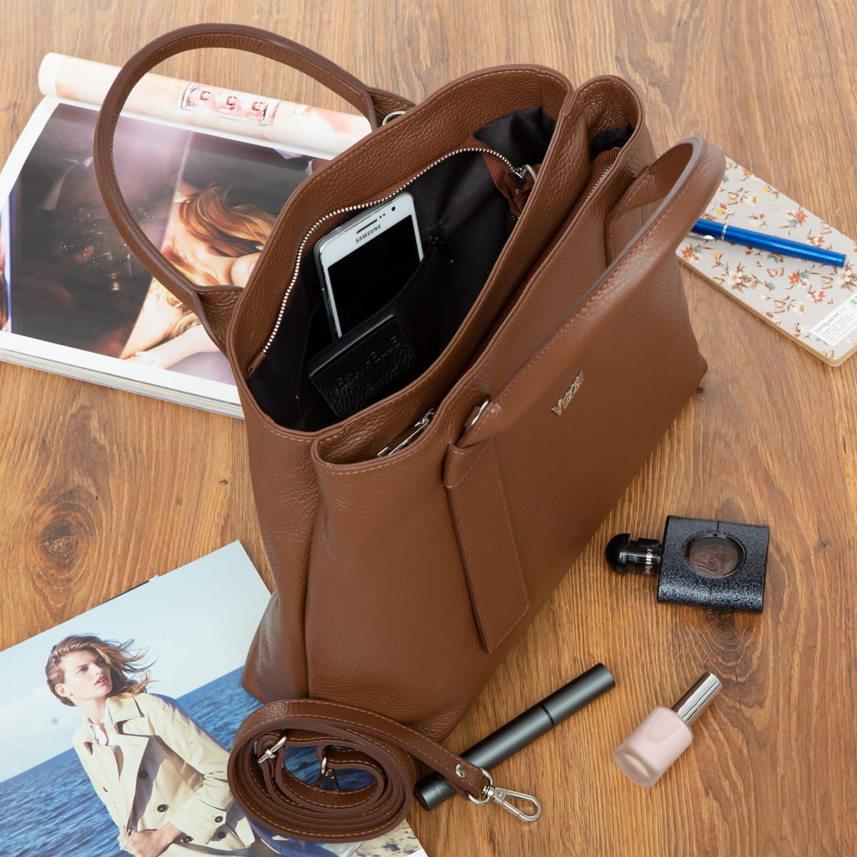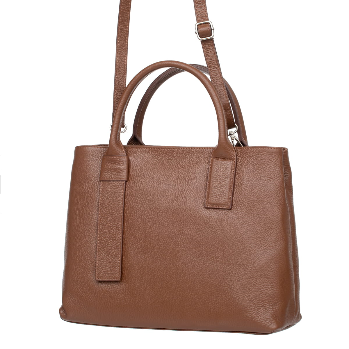 Torebka z wysokogatunkowej, włoskiej skóry licowej. Dwie oddzielne komory. Naturalna faktura skóry. Przystosowana do noszenia na ramieniu lub w ręku.