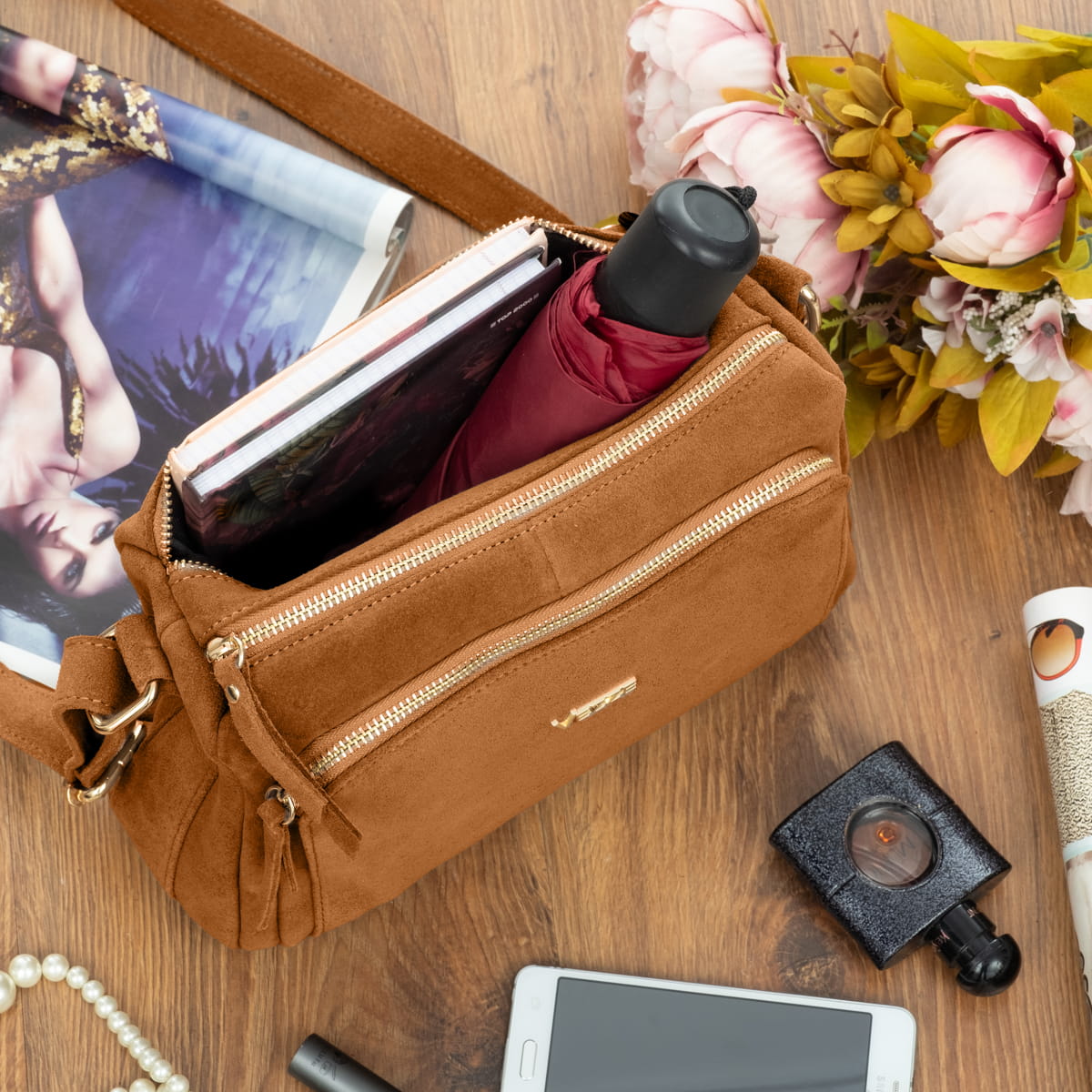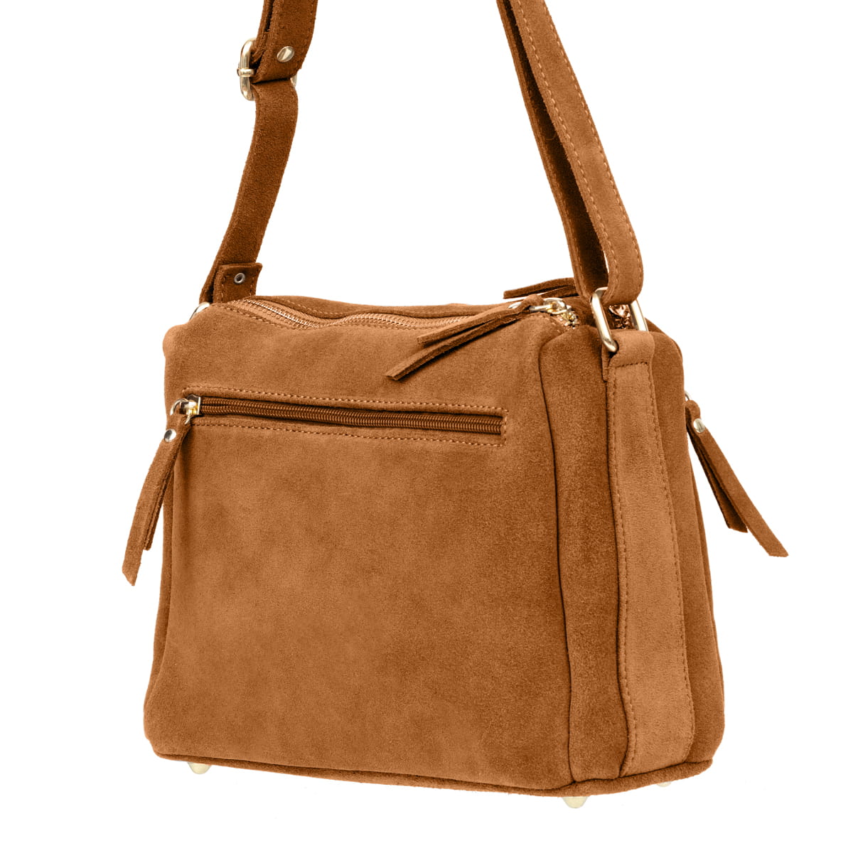 Torebka z wysokogatunkowej, włoskiej skóry zamszowej. Dzięki licznym komorom i kieszeniom przedmioty w torebce można wygodnie posegregować. Przystosowana do noszenia na ramieniu.