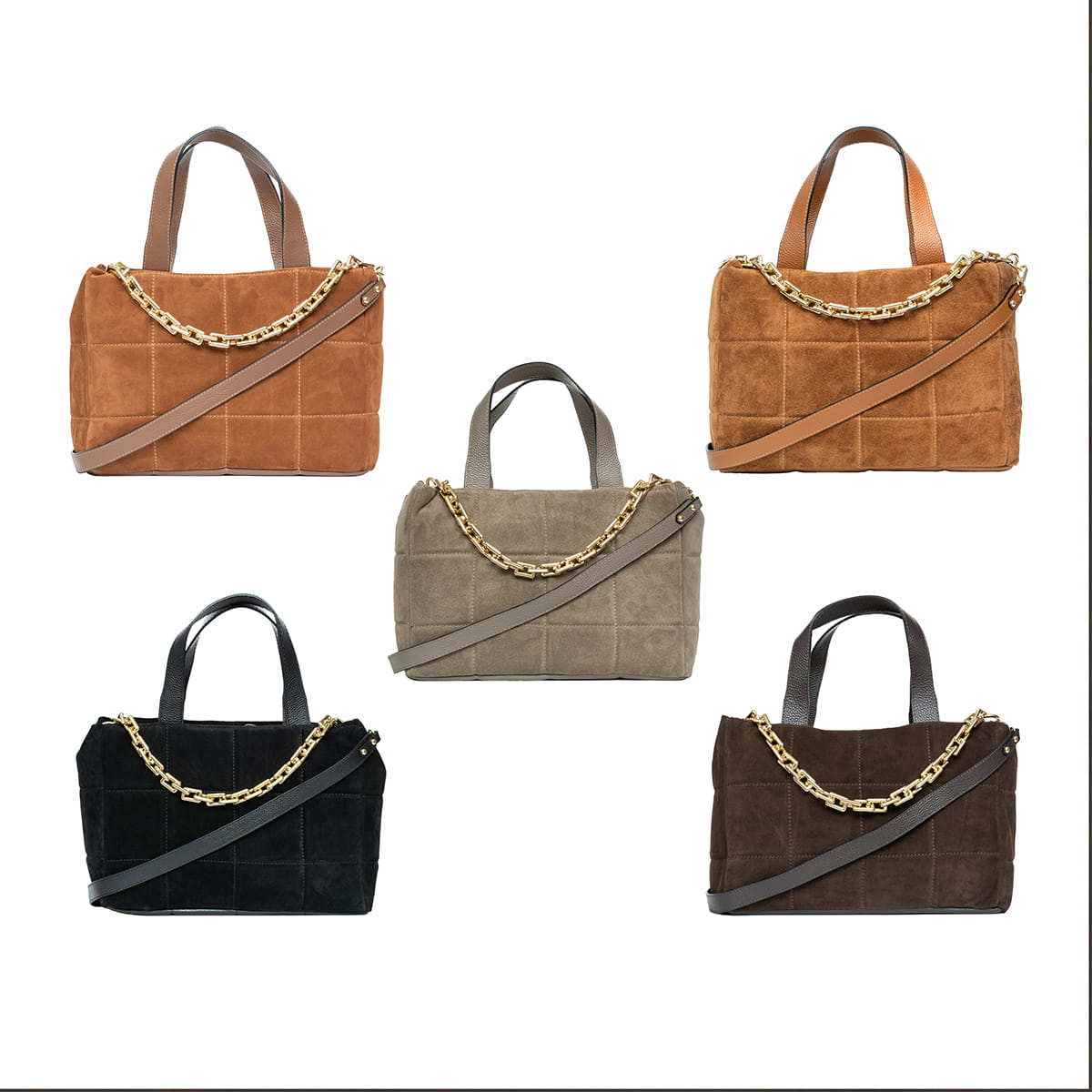 Torebka z wysokogatunkowej, włoskiej skóry zamszowej. Grube i miękkie ścianki. Przystosowana do noszenia na ramieniu, przedramieniu lub w ręku.