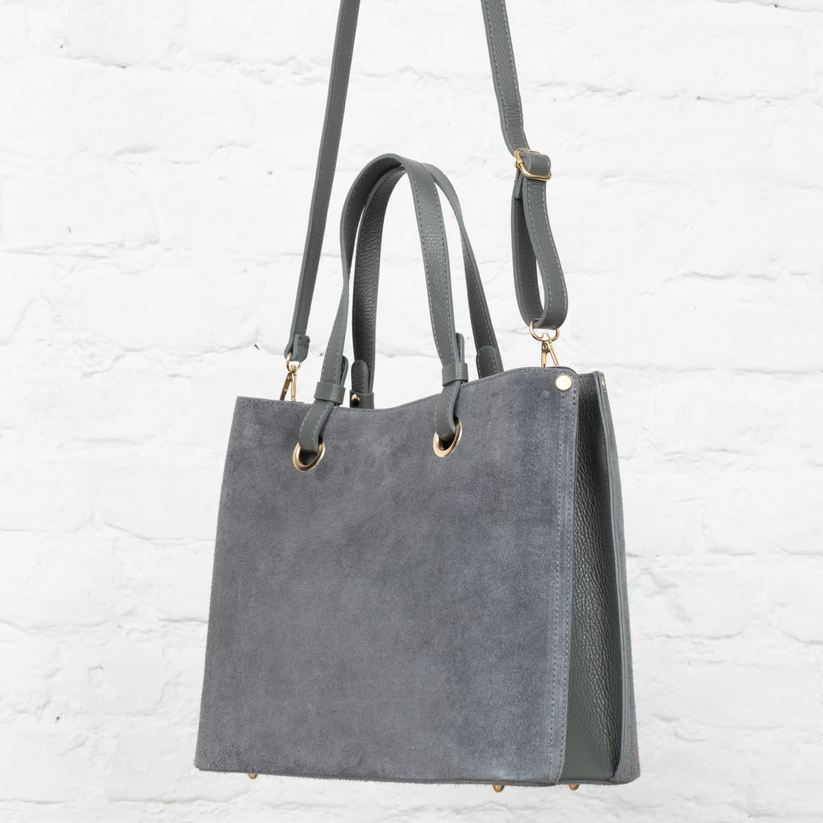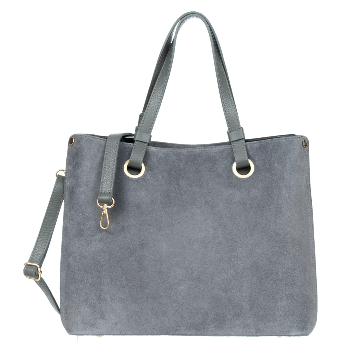 Trzykomorowa torebka z wysokogatunkowej, włoskiej skóry zamszowej. Przystosowana do noszenia na ramieniu lub w ręku.