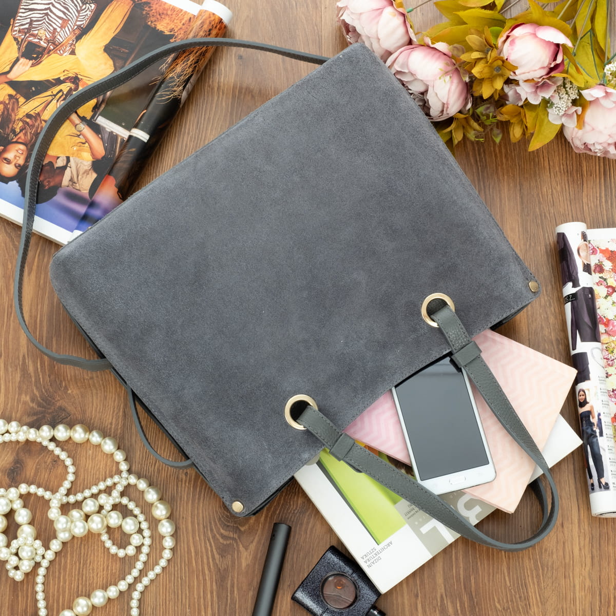 Torebka Zamszowa Vezze Ventura Grande Vello Grafitowa-VEZ082-DGRAY