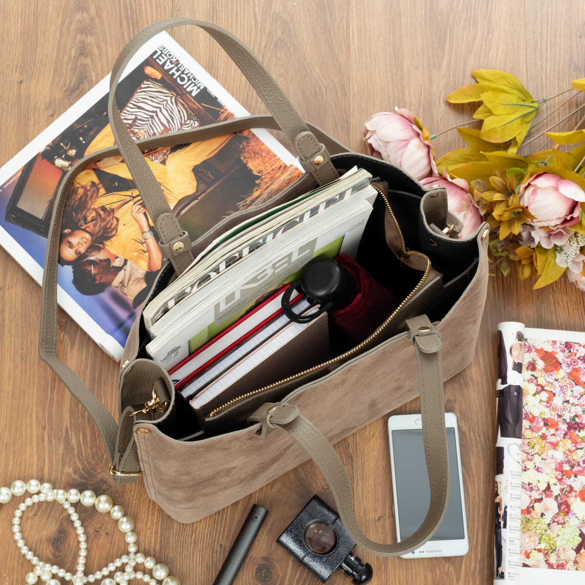 Trzykomorowa torebka z wysokogatunkowej, włoskiej skóry zamszowej. Przystosowana do noszenia na ramieniu lub w ręku.