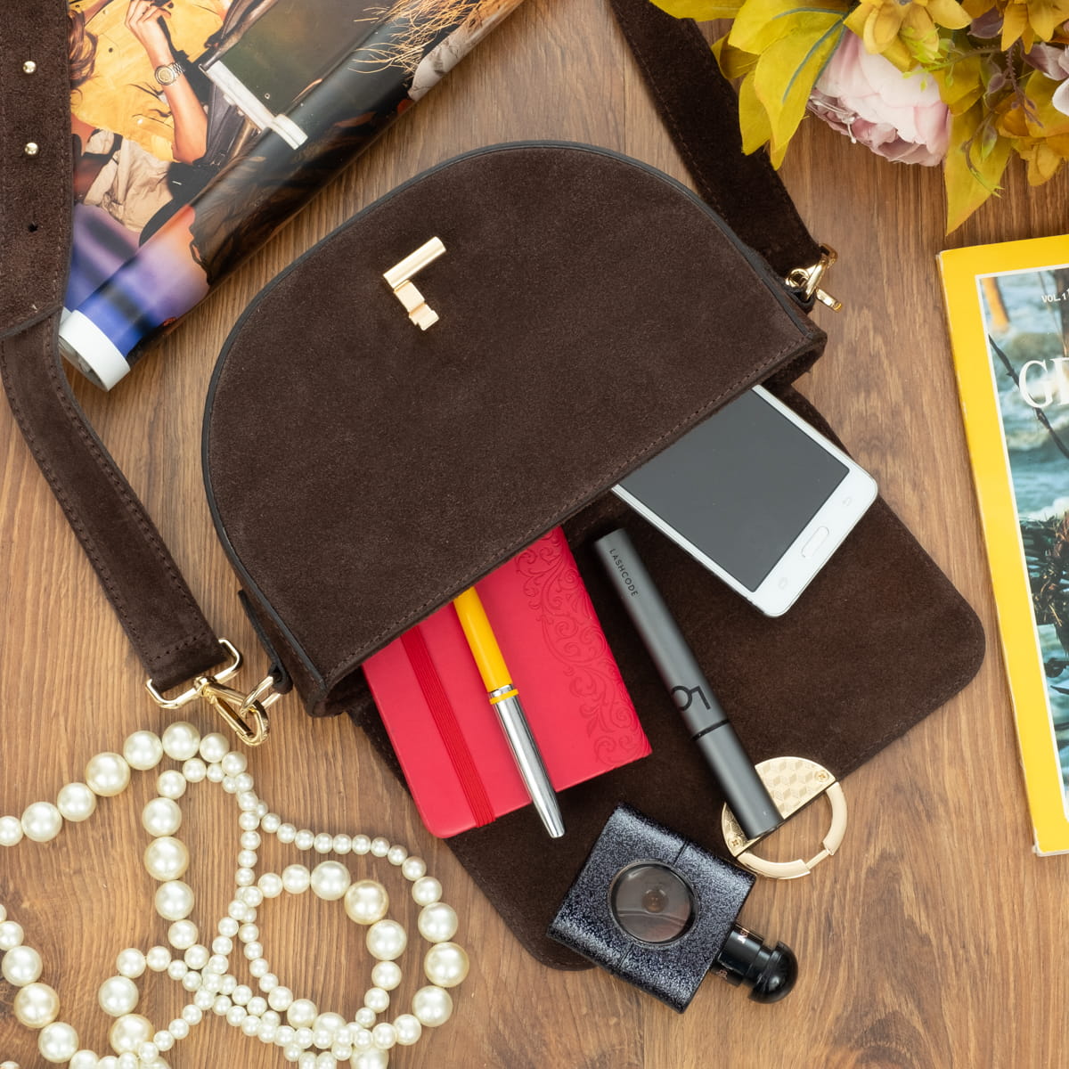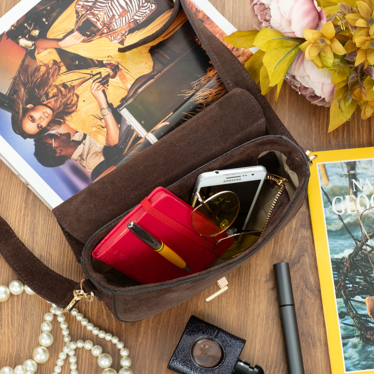 Torebka z wysokogatunkowej, włoskiej skóry zamszowej z wygodnym paskiem na ramię.
