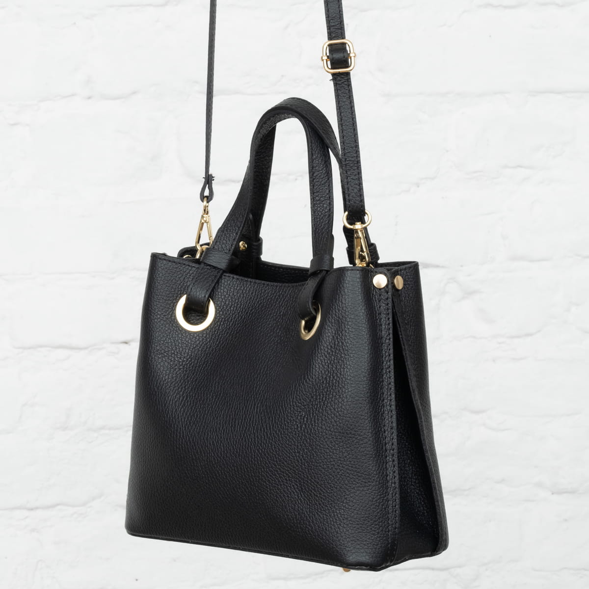 Trzykomorowa torebka z wysokogatunkowej, włoskiej skóry licowej. Naturalna faktura skóry. Przystosowana do noszenia na ramieniu lub w ręku.