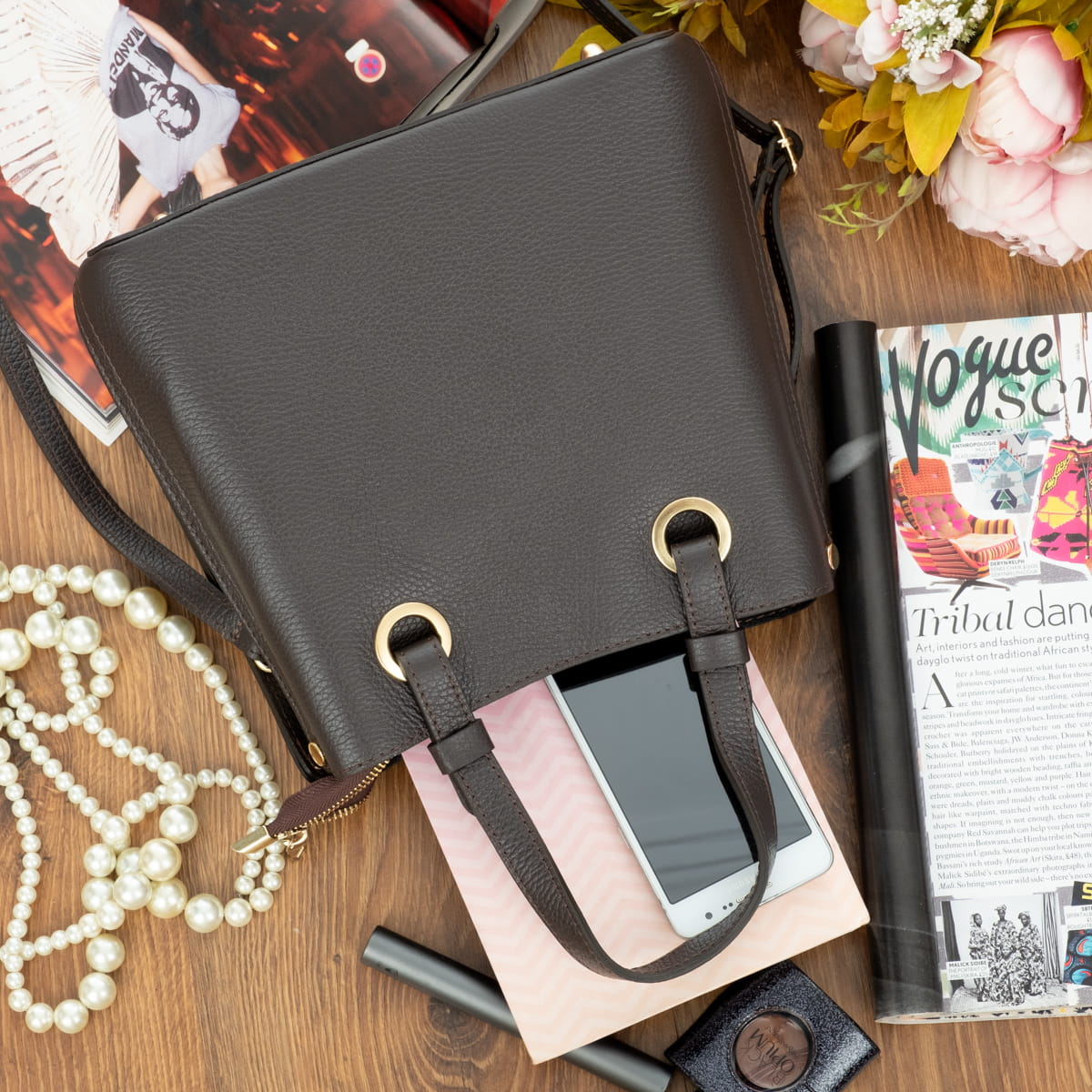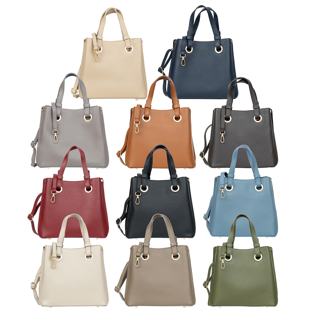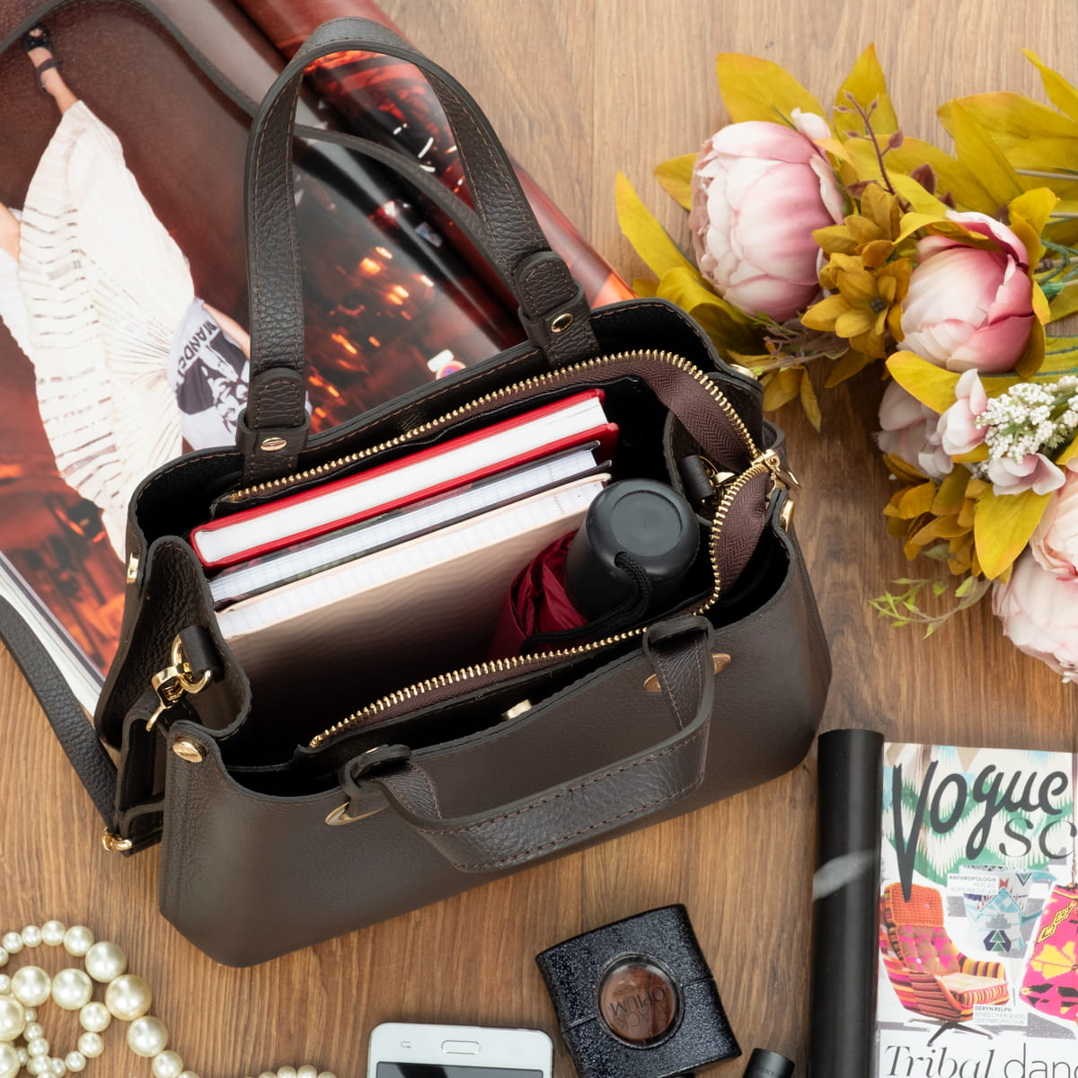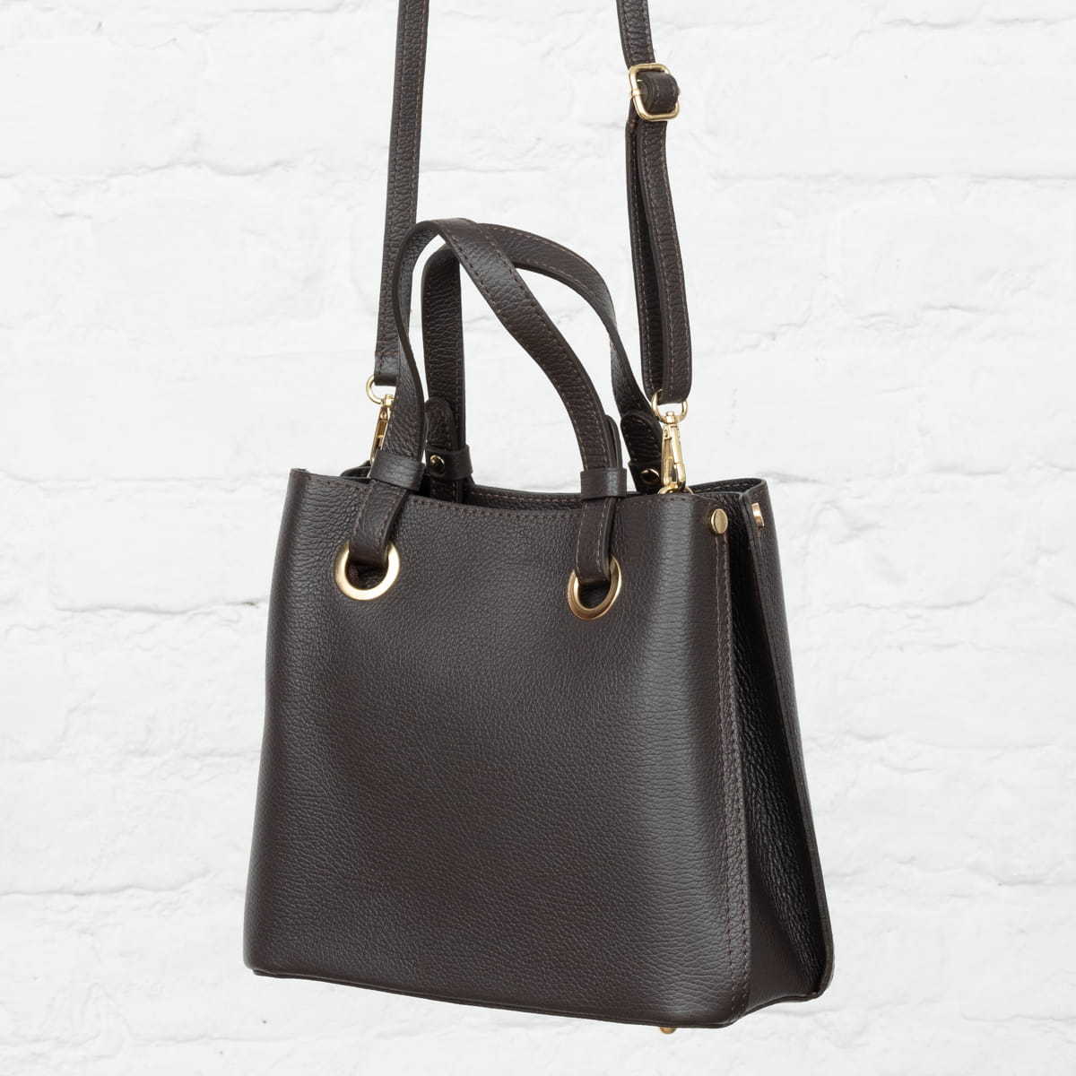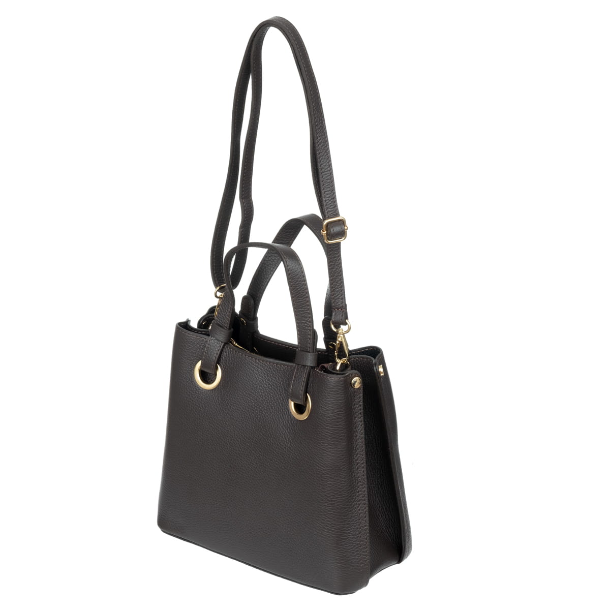 Trzykomorowa torebka z wysokogatunkowej, włoskiej skóry licowej. Naturalna faktura skóry. Przystosowana do noszenia na ramieniu lub w ręku.